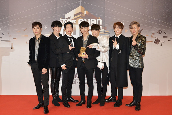 '2016 마마(Mnet Asian Music Awards)'시상식에서 '월드와이드 페이브릿상'을 수상한 그룹 갓세븐(GOT7 : JB, 마크, 잭슨, 진영, 영재, 뱀뱀, 유겸)이 지난 2일 홍콩AWE(AsiaWorld-Expo) 'Thanks Zone'에서 트로피와 함께 포토타임을 갖고 있다. (사진=CJ E&M)