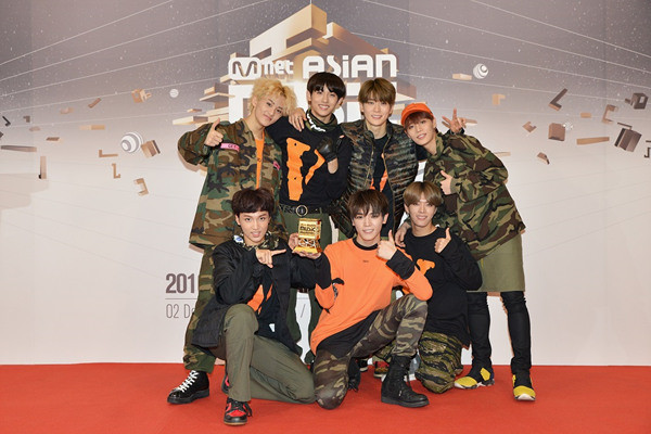 '2016 마마(Mnet Asian Music Awards)'시상식에서 '남자 신인상'을 수상한 그룹 엔시티127(NCT 127 : 해찬, 유타, 윈윈, 태용, 재현, 마크, 태일)가 지난 2일 홍콩AWE(AsiaWorld-Expo) 'Thanks Zone'에서 트로피와 함께 포토타임을 갖고 있다. (사진=CJ E&M)