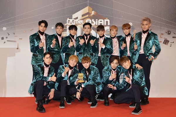 '2016 마마(Mnet Asian Music Awards)'시상식에서 월드퍼포머상을 수상한 그룹 세븐틴(Seventeen : 에스쿱스, 정한, 조슈아, 준, 호시, 원우, 도겸, 민규, 디에잇, 승관, 버논, 디노, 우지)이 지난 2일 홍콩AWE(AsiaWorld-Expo) 'Thanks Zone'에서 트로피와 함께 포토타임을 갖고 있다. (사진=CJ E&M)