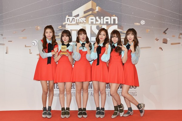 '2016 마마(Mnet Asian Music Awards)'시상식에서 베스트 보컬 퍼포먼스 여자 그룹상을 수상한 여자친구(소원, 예린, 은하, 유주, 신비, 엄지)가지난 2일 홍콩AWE(AsiaWorld-Expo) 'Thanks Zone'에서 트로피와 함께 포토타임을 갖고 있다. (사진=CJ E&M)
