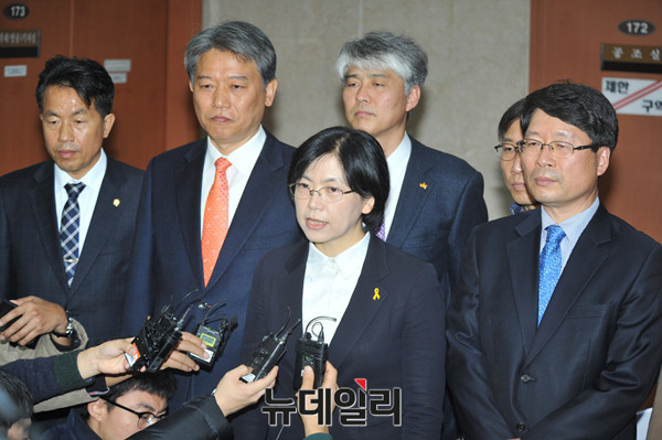 전 통합진보당 관졔자 및 이정희 전 대표가 5일 국회에서 정론관에서 통합진보당 강제해산 청와대 개입 진상 규명을 촉구기자회견을 갖고 기자들의 질문에 답하고 있다.