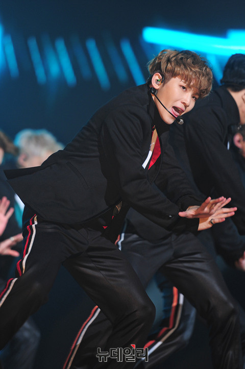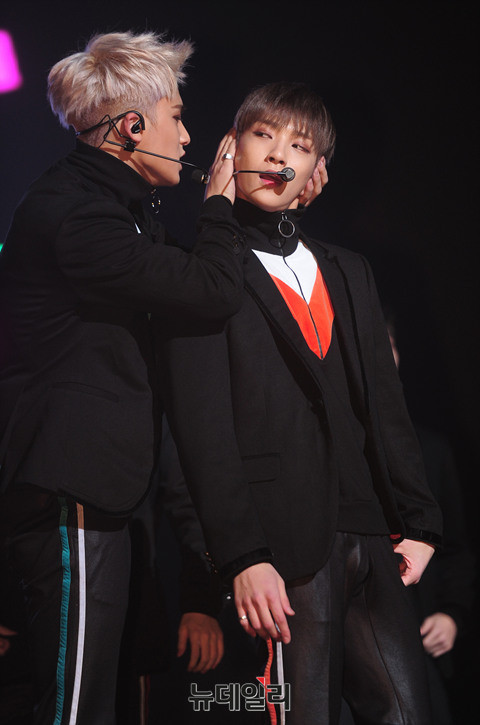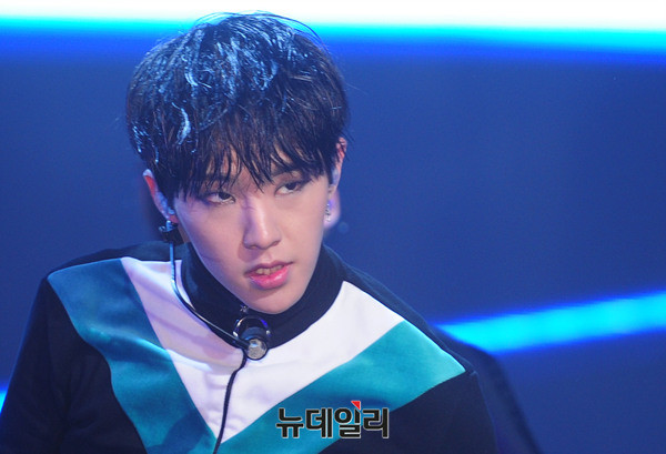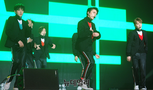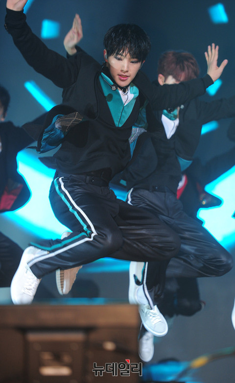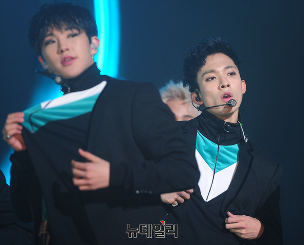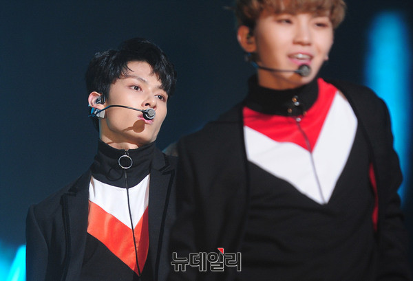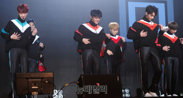 그룹 세븐틴(Seventeen : 에스쿱스, 정한, 조슈아, 준, 호시, 원우, 도겸, 민규, 디에잇, 승관, 버논, 디노, 우지) 이 5일 오후 서울 용산구 블루스퀘어에서 열린 세번 째 미니앨범 '고잉 세븐틴(Going Seventeen)' 발매기념 쇼케이스에서 타이틀곡 '붐붐(BOOM BOOM)'을 선보이고 있다.