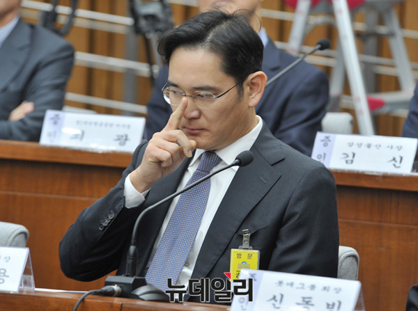 삼성전자 이재용 부회장이 6일 오전 국회에서 열린 '박근혜 정부의 최순실 등 민간인에 의한 국정농단 의혹사건 진상규명을 위한 국정조사'에서 생각에 잠겨있다. (사진=공동취재단)