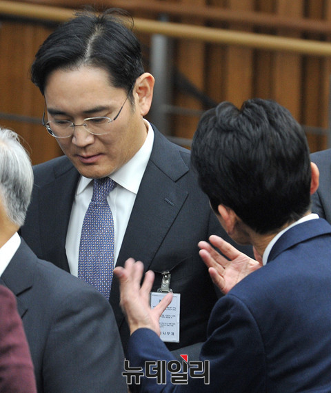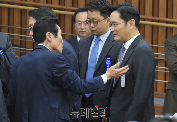 정의당 윤소하 의원이 6일 오전 국회에서 열린 '박근혜 정부의 최순실 등 민간인에 의한 국정농단 의혹사건 진상규명을 위한 국정조사' 오전 질의가 끝나자 삼성전자 이재용 부회장에게 다가가 말을 건내고 있다. (사진=공동취재단)