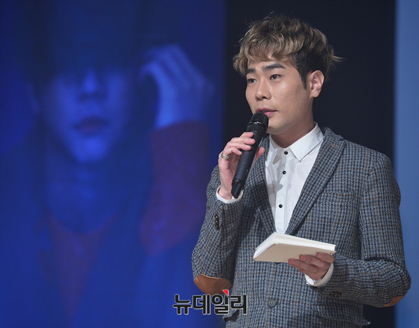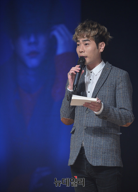 가수 뮤지가 6일 오후 서울 강남구 일지아트홀에서 첫 번째 솔로 미니앨범 'THUNDER(썬더)' 쇼케이스에서 천둥을 소개하고 있다. 뮤지는 이날 쇼케이스에서 사회를 맡았다.