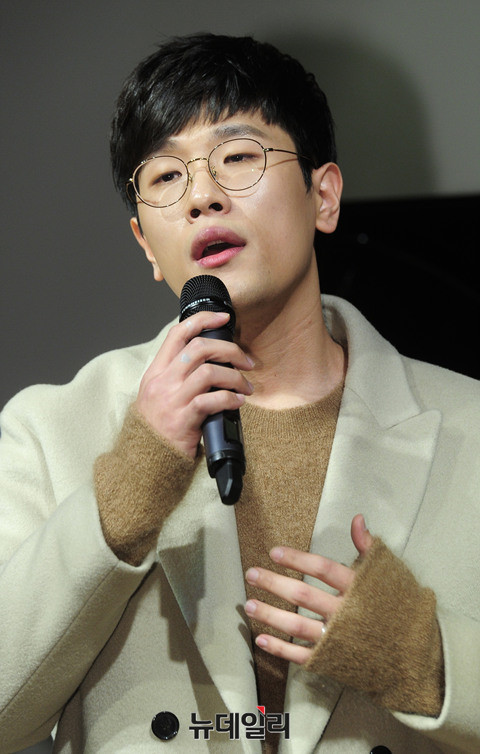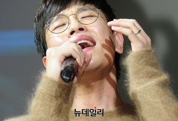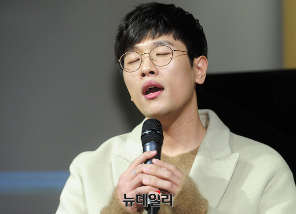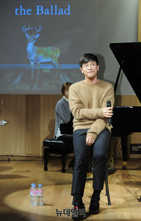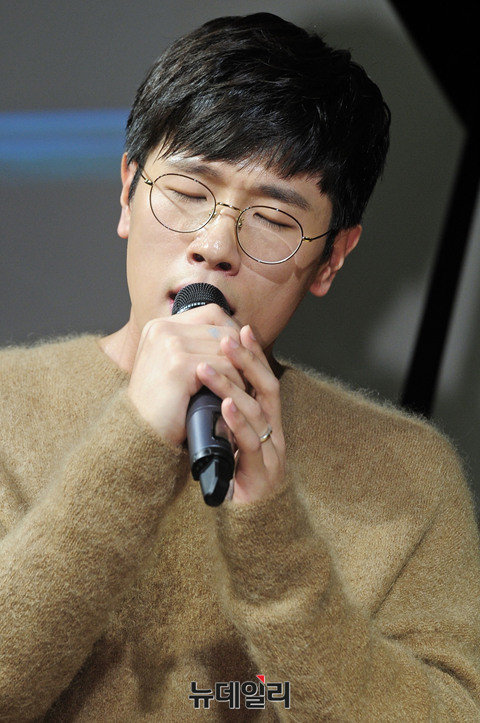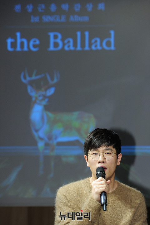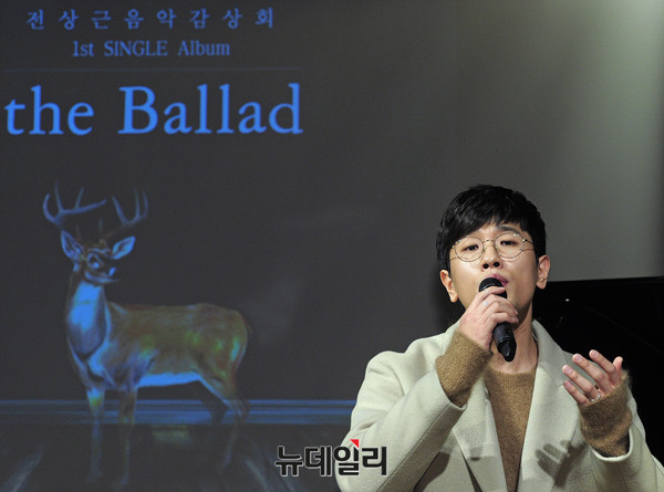 가수 전상근이 7일 오후 서울 용산구 스트라디움(STRADEUM)에서 열린 데뷔 첫 싱글 '더 발라드(The Ballad)' 발매 기념 쇼케이스에서 타이틀곡 '내 손으로 숨을 막는 일'을 열창하고 있다.