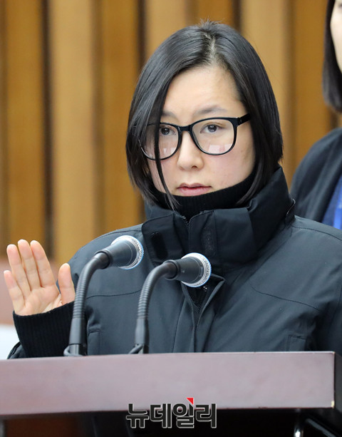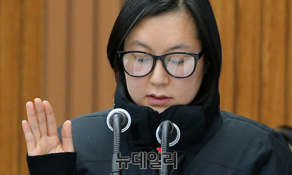 최순실의 조카 장시호가 7일 서울 여의도 국회에서 열린 '최순실 국정농단 진상규명을 위한 국정조사 2차 청문회'에 참석해 선서를 하고 있다. (사진=공동취재단)