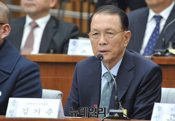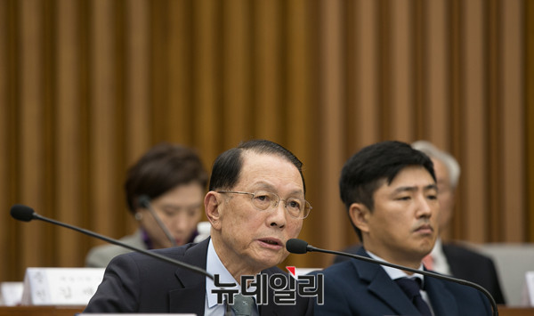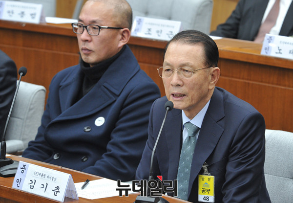 김기춘 전 대통령 비서실장이 7일 국회에서 열린 '최순실 국정농단 진상규명을 위한 국정조사 2차 청문회'에 참석해 위원들의 질문에 답하고 있다. (사진=공동취재단)