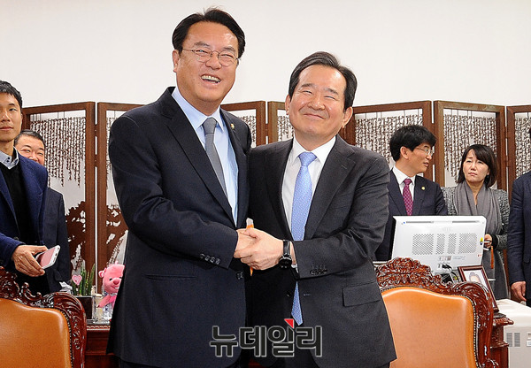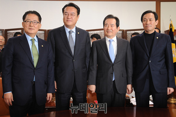 여야 3당(새누리 정진석, 더불어민주당 우상호, 국민의당 박지원) 원내대표와 정세균 국회의장이 8일 오전 국회 의장실에서 9일 열리는 박근혜 대통령 탄핵소추안 관련 회동을 갖고 있다.