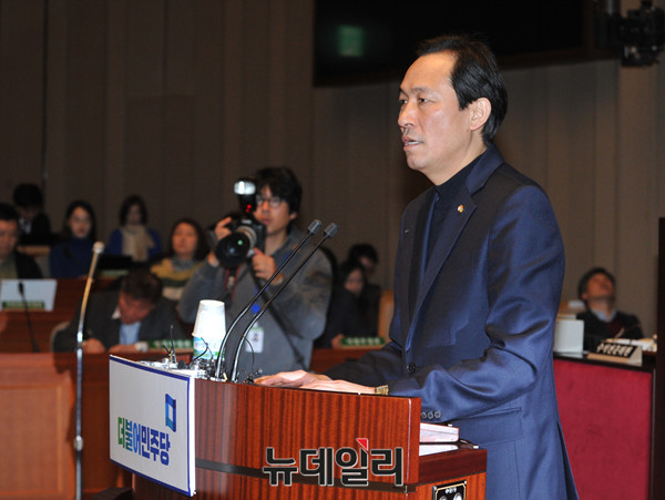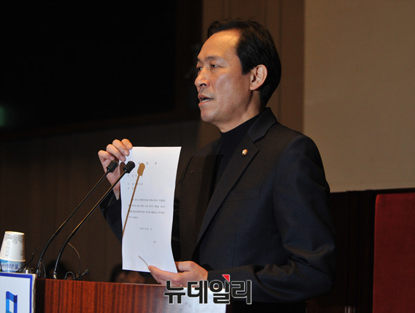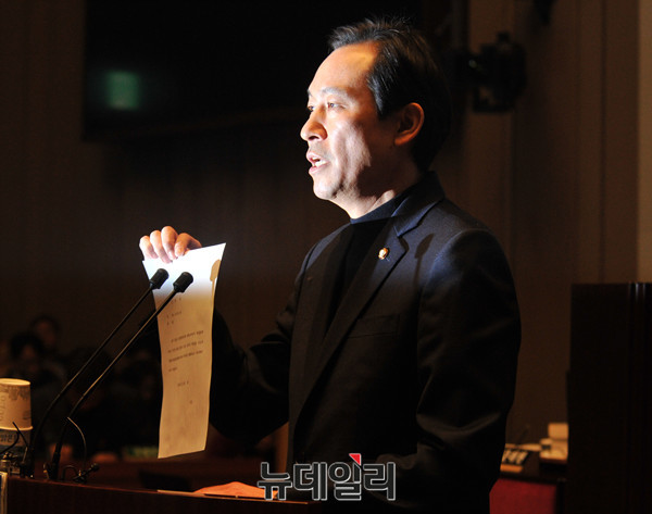 더불어민주당 우상호 원내대표가 8일 오전 국회에서 열린 의원총회에서 박근혜 대통령의 탄핵안이 부결 될 경우 소속 전원이 사퇴할 것을 결의하며 사직서를 들어보이고 있다.