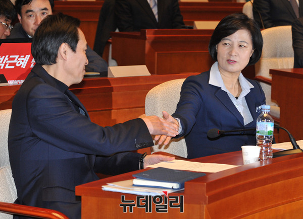 더불어민주당 추미애 대표와 우상호 원내대표 8일 오전 국회에서 열린 의원총회에 참석해 악수를 나누고 있다.