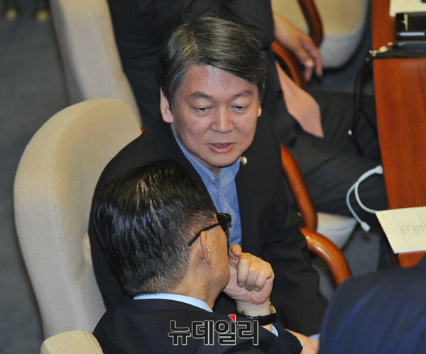국민의당 안철수 전 상임공동대표와 박지원 원내대표가 8일 국회에서 열린 본회의에서 대화를 나누고 있다.