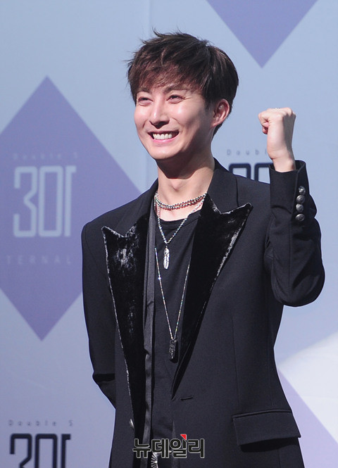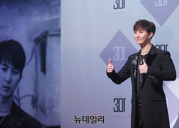 더블에스301(SS301 : 허영생, 김규종, 김형준) 김형준이 8일 오후 이화여자대학교 삼성홀에서 두 번째 미니앨범 '이터널 0(ETERNAL 0)', '이터널 1'발매기념 쇼케이스에서 포토타임을 갖고 있다.
