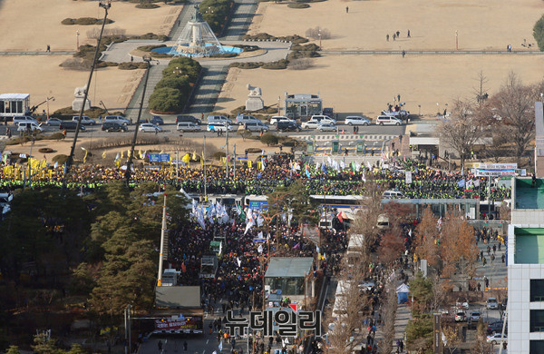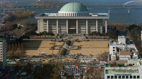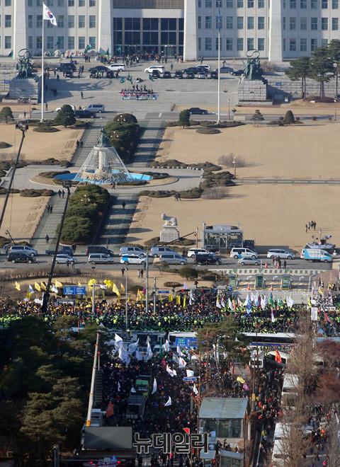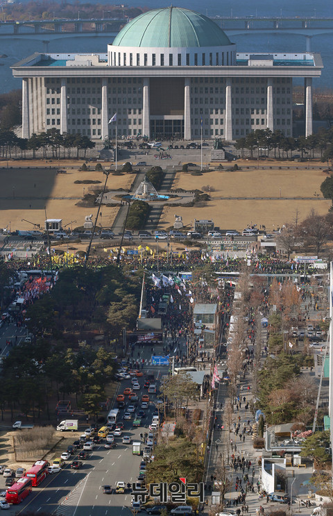 박근혜 대통령 탄핵소추안 표결일인 9일 오후 국회의사당 인근에는 경찰과 집회 참가자들이 대치하고 있다. 이날 진행된 탄핵소추안은 재적의원 300명 중 299명이 투표에 참여했다. 234표, 반대 56표, 무효 7표, 기권 2표로 소추안은 가결됐다. (사진=사진공동취재단)