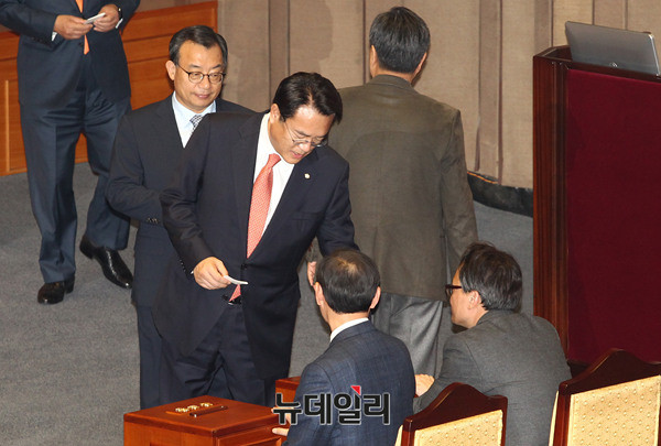 새누리당 이정현 대표와 정진석 원내대표가 9일 국회 본회의장에서 열린 박근혜 대통령 탄핵소추안에 투표하고 있다. 이날 진행된 탄핵소추안은 재적의원 300명 중 299명이 투표에 참여했다. 234표, 반대 56표, 무효 7표, 기권 2표로 소추안은 가결됐다. (사진=사진공동취재단)