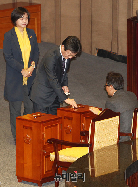 새누리당 유승민 의원과 정의당 이정미 의원이 9일 오후 국회 본회의장에서 열린 박근혜 대통령 탄핵소추안에 투표하고 있다. 이날 진행된 탄핵소추안은 재적의원 300명 중 299명이 투표에 참여했다. 234표, 반대 56표, 무효 7표, 기권 2표로 소추안은 가결됐다. (사진=사진공동취재단)