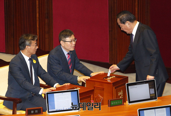 새누리당 서청원 의원이 9일 오후 국회 본회의장에서 열린 박근혜 대통령 탄핵소추안에 투표하고 있다. 이날 진행된 탄핵소추안은 재적의원 300명 중 299명이 투표에 참여했다. 234표, 반대 56표, 무효 7표, 기권 2표로 소추안은 가결됐다. (사진=사진공동취재단)