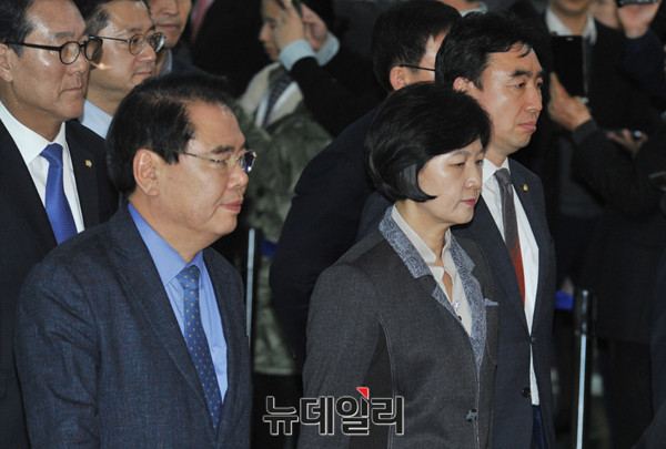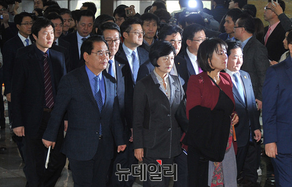 박근혜 대통령 탄핵안 표결을 앞둔 9일 오후 더불어민주당 추미애 대표와 소속 의원들이 국회 본회의장으로 입장하고 있다.