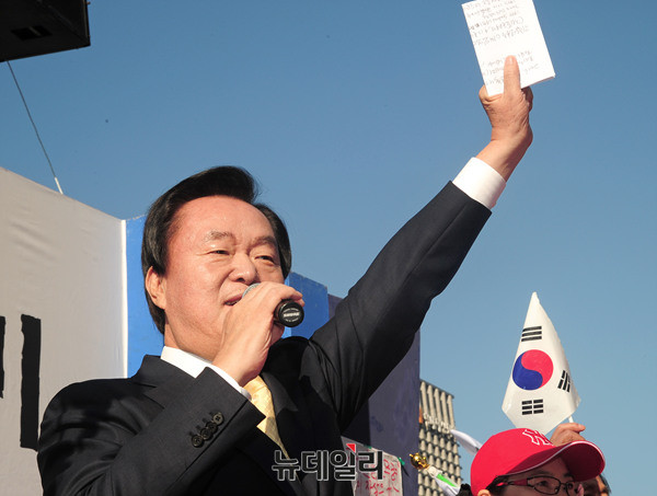 김경재 자유총연맹 총재가 10일 오전 서울 청계광장에서 열린 '탄핵무효국민총궐기대회'에서 발언하고 있다.