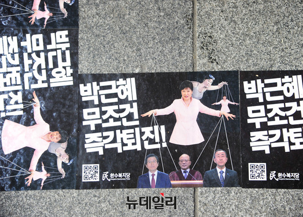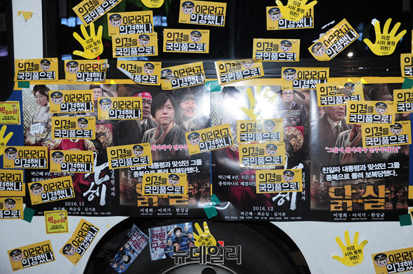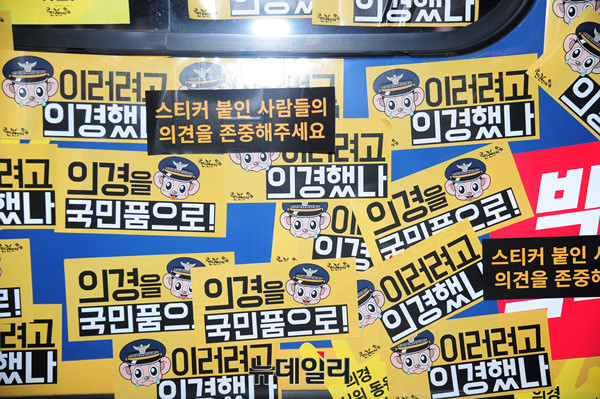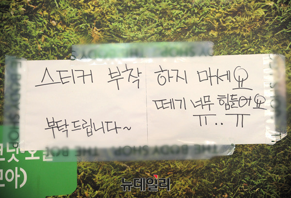 떼촛불집회가 열린 10일 오후 서울 광화문광장의 한 상점에는 '스티커를부착하지말아달라'는 호소문이 붙어있다.