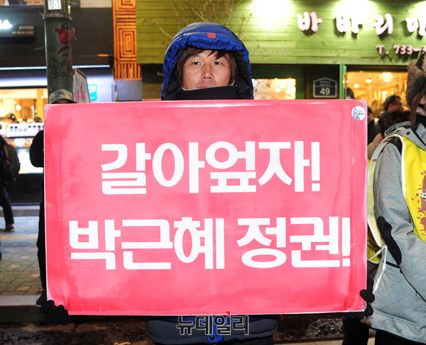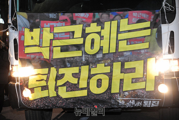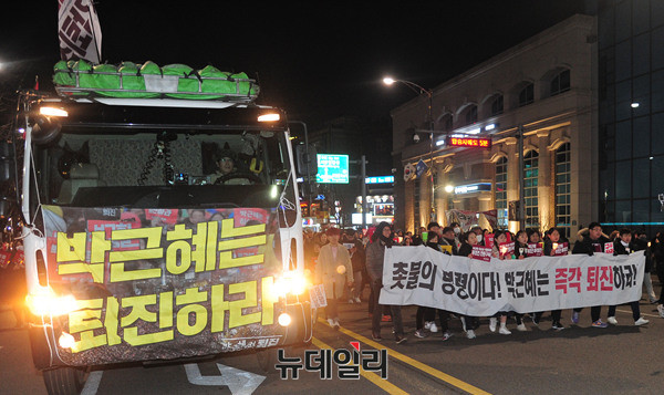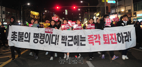 떼촛불집회가 열린 10일 오후 집회 참가자들이 광화문에서 청운동 방향으로 '즉각퇴진'하라는 현수막을 들고 거리행진을 하고 있다.