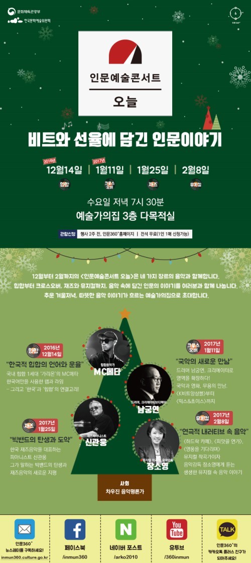 문화체육관광부와 한국문화예술위원회가 12월부터 내년 2월까지 대학로 예술가의집에서 '비트와 선율에 담긴 인문이야기'를 주제로 '인문예술콘서트 오늘'을 연다.