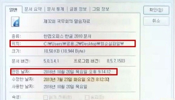 의문점은 또 있다. 이날 뉴스룸은 "PC안에 저장돼 있는 파일 안에서 최순실이 대통령의 연설문을 미리 받아봤다는 사실을 확인할 수 있었다"며 증거 자료로 PC 모니터 화면을 공개했다.