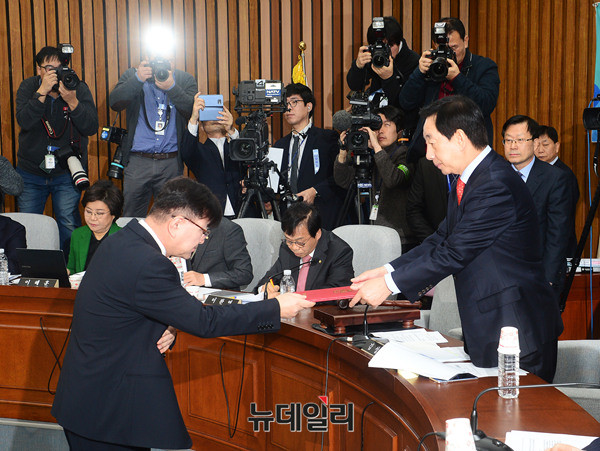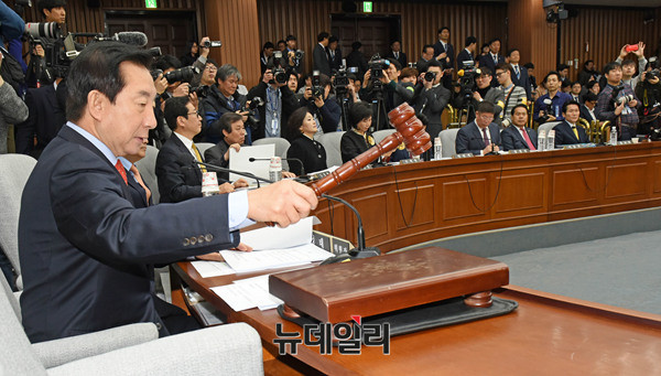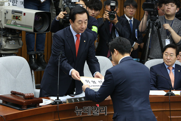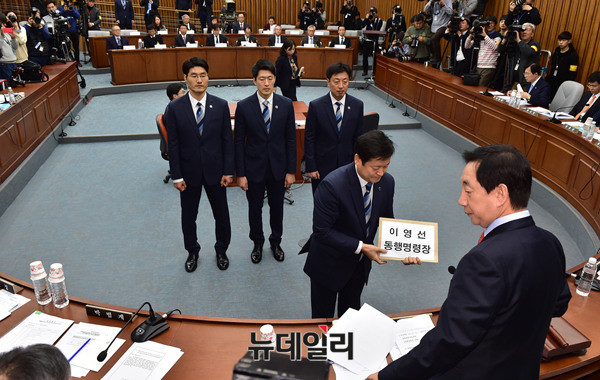 김성태 국정조사특별위원회 위원장이 14일 오전 국회에서 열린 '박근혜 정부의 최순실 등 민간인에 의한 국정농단 의혹 사건 진상 규명을 위한 국정조사 특별위원회'에서 검찰 및 특검 이유를 들어 불출석한 이영선 청와대 행정관에 대해 국회 경위에게 동행명령서를 전달하고 있다. (사진=사진공동취재단)