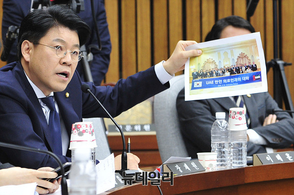 장제원 새누리당 의원이 14일 오후 국회에서 열린 '박근혜 정부의 최순실 등 민간인에 의한 국정농단 의혹사건 진상규명을 위한 국정조사특별위원회 제3차 청문회'에서 첨부자료를 들고 질의하고 있다. (사진=사진공동취재단)