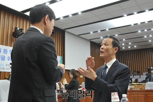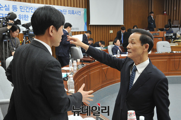 김장수 전 국가안보실장이 14일 오후 국회에서 열린 '박근혜 정부의 최순실 등 민간인에 의한 국정농단 의혹사건 진상규명을 위한 국정조사 제3차 청문회'에서 새누리당 하태경 의원과 대화를 나누고 있다.