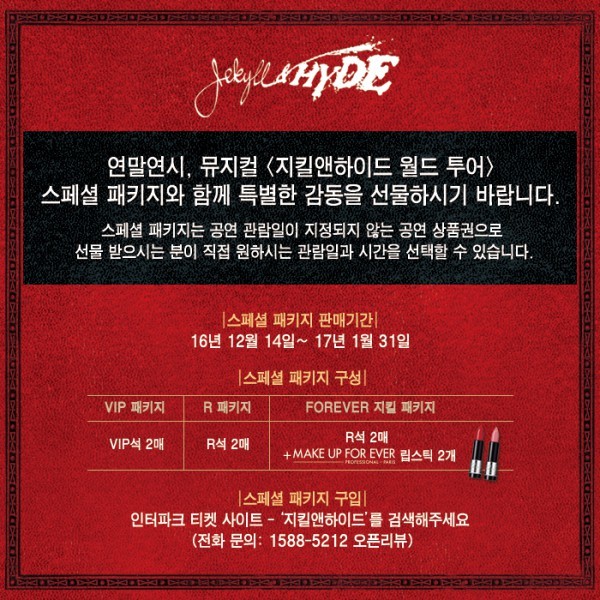 뮤지컬 '지킬앤하이드 월드 투어'가 연말연시를 맞아 한정판 스페셜 패키지를 내놨다.지난 14일부터 판매를 시작한 스페셜 패키지는 500세트 한정으로, 내년 3월 개막하는 '지킬앤하이드 월드 투어' 서울 공연을 관람할 수 있다.스페셜 패키지는 좌석 등급별 예매권이 제공되는 'VIP 패키지'(2매, 27만원)와 'R 패키지'(2매, 23만4천원), 프로페셔널 메이크업 브랜드 메이크업포에버의 신제품 ARTIST ROUGE가 함께 제공되는 'FOREVER 지킬'(R석 2매, 립스틱 2개, 29만원) 총 3가지로 구성됐다.패키지 구매 시 제공되는 공연 예매권은 '지킬앤하이드 월드 투어' 서울 공연 티켓이다. 2017년 3월 10일부터 3월 31일까지 관람할 수 있으며, 해당 패키지권을 선물받은 관객이 원하는 날짜와 시간을 자유롭게 선택할 수 있다.특히 'FOREVER 지킬' 패키지에 포함된 메이크업포에버의 PETAL PINK 컬러 립스틱은 지고 지순한 여인 엠마를, 또 다른 컬러 TRUE RED는 강렬한 루시를 떠올리게 만든다.뮤지컬 '지킬앤하이드 월드 투어'는 오는 25일 대구 공연을 마치고 국내 7개 도시 투어를 진행하며, 2017년 3월 10일 블루스퀘어 삼성전자홀에서 서울 공연을 시작할 예정이다.[사진=오디컴퍼니]