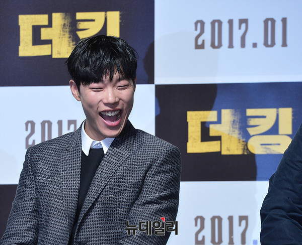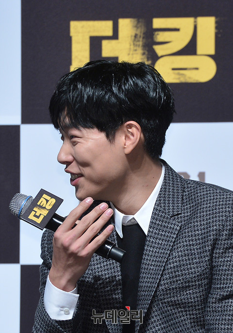 배우 류준열이 15일 오전 서울 강남구 압구정CGV에서 열린 영화 '더 킹(감독 한재림)' 제작보고회에서 활짝 웃고 있다.