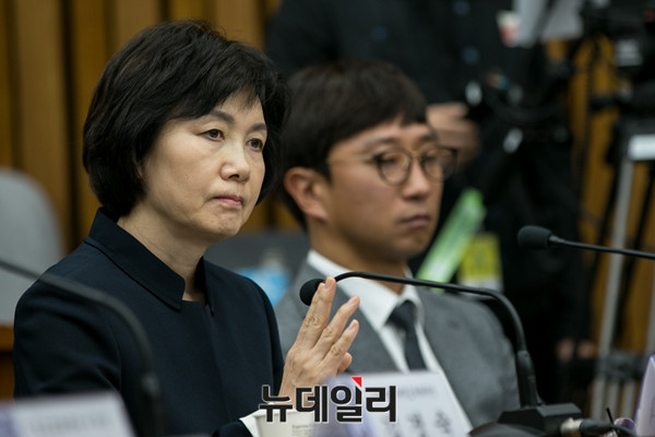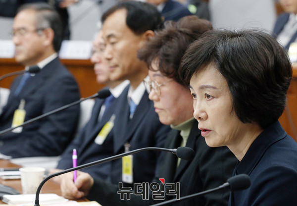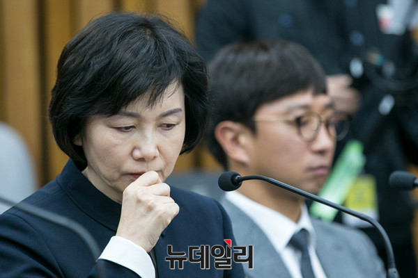 최경희 전 이화여대 총장이 15일 오전 국회에서 열린 '박근혜 정부의 최순실 등 민간인에 의한 국정농단 의혹사건 진실규명을 위한 국정조사특위 제4차 청문회'에 출석해 의원질의에 답하고 있다. (사진=공동취재단)