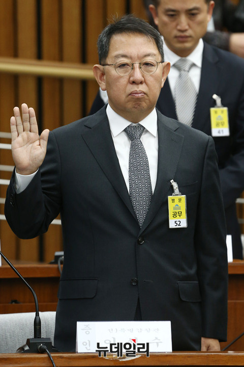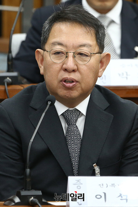 이석수 전 청와대 특별감찰관이 14일 오전 국회에서 열린 '박근혜 정부의 최순실 등 민간인에 의한 국정농단 의혹 사건 진상 규명을 위한 국조특위 제4차 청문회'에서 증인선서를 하고 있다. (사진=사진공동취재단)