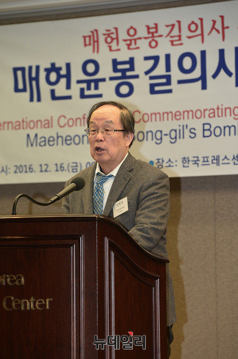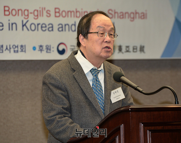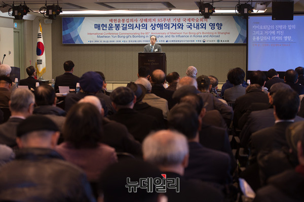 김학준 단국대·한동대 석좌교수가 16일 오전 한국프레스센터에서 열린 '매헌윤봉길의사 상해의거 85주년 기념 국제학술회의'에서 기조발표를 하고 있다. 김 교수는 '카이로회담의 진행과 합의 그리고 거기에 끼친 윤봉길의사 의거의 영향'을 주제로 발표했다.