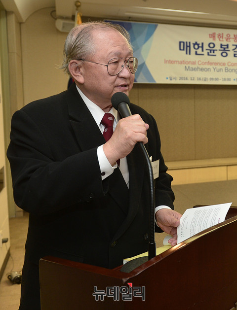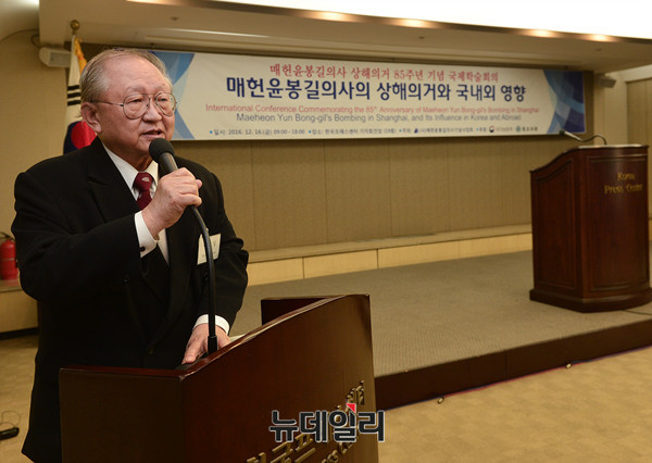 이준일 중앙대 명예교수가 16일 오전 한국프레스센터에서 열린 '매헌윤봉길의사 상해의거 85주년 기념 국제학술회의'에서 기조발표 사회를 보고 있다. 기조발표는 김학준 단국대·한동대 석좌교수와 제임스 매트레이 美캘리포니아주립대 교수가 맡았다.