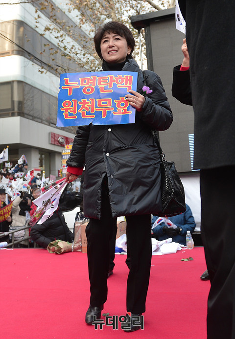 정미홍 전 아나운서가 17일 오전 11시부터 서울 종로구 헌법재판소 인근에서 진행된 박근혜 대통령 탄핵을 반대하는 대규모 집회에 참가했다. 이날 집회 참가자들은 태극기를 흔들며 집회에 임했다. 주최 측은 대형태극기와 장미꽃을 준비했다.