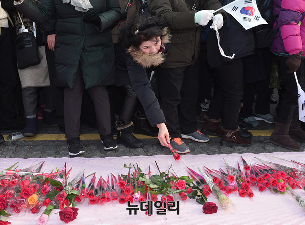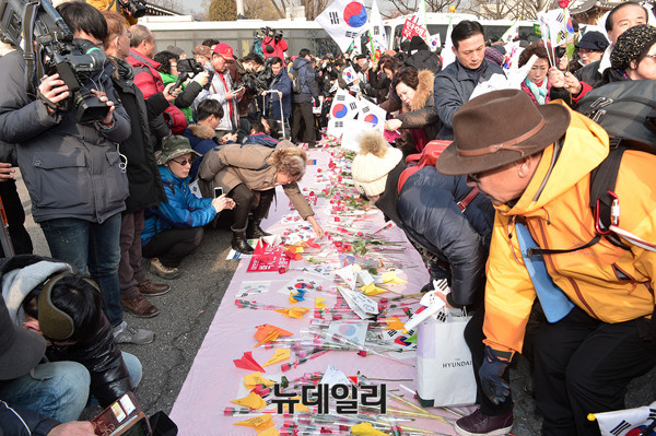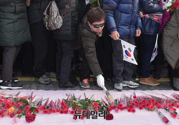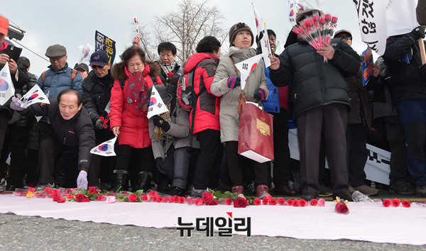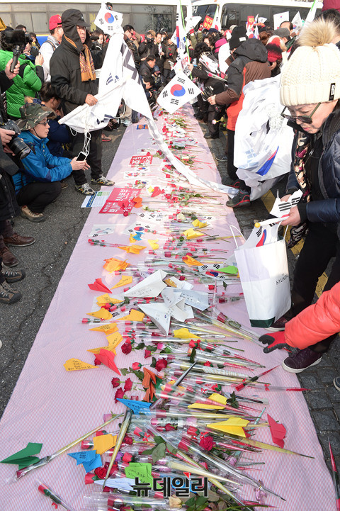 박사모를 비롯한 애국단체가 17일 오후 청와대 인근 삼청로에서 박근혜 대통령에게 전달 될 장미꽃을 헌화하고 있다. 참가자들은 줄을 서 장미꽃을 헌화하고, 직접 쓴 손편지를 놓아두기도 했다.