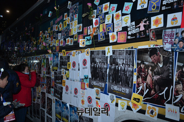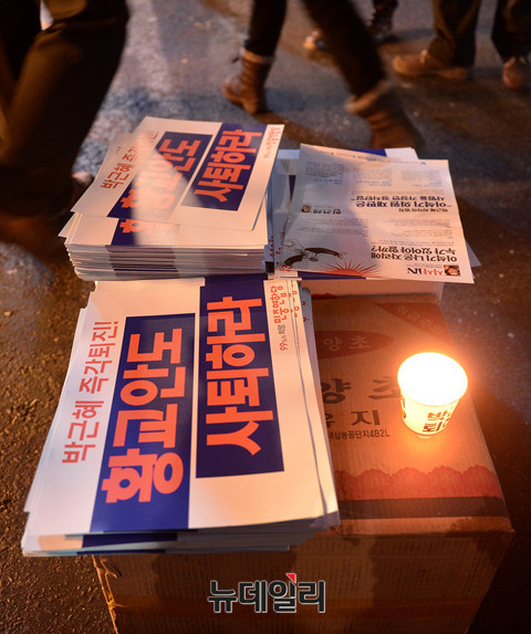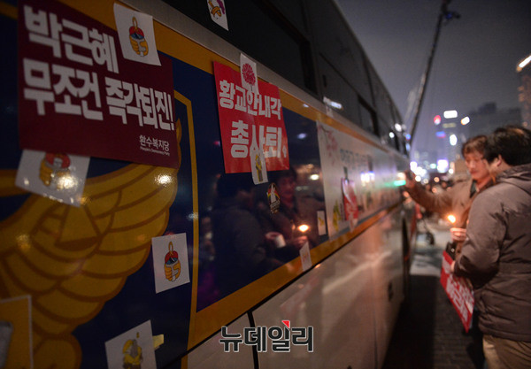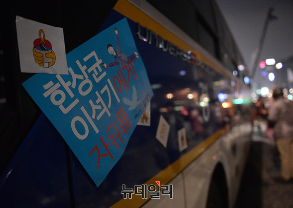 박근혜 대통령 퇴진을 외치는 8차 떼촛불 집회가 17일 오후 광화문광장 일대에서 진행된 가운데 한상균, 이석기에게 자유를 요구하는 손피켓이 경찰차량에 붙어있다. 반면 박근혜 대통령과 황교안 국무총리는 즉시 퇴진하라는 손피켓도 쉽게 발견 할 수 있다.