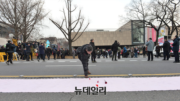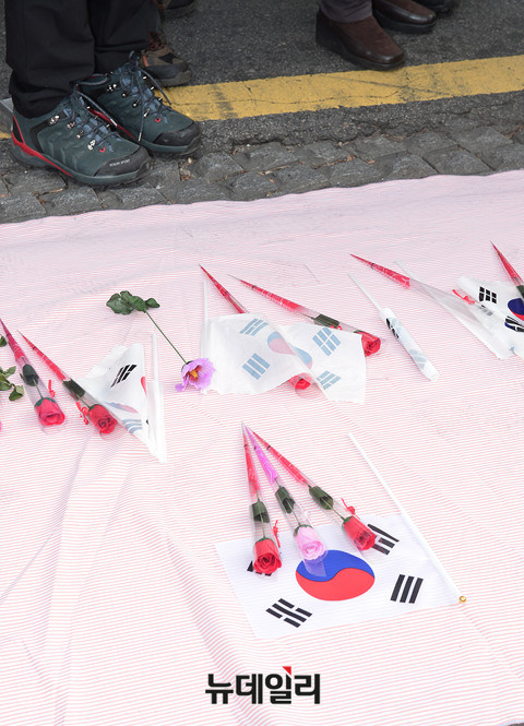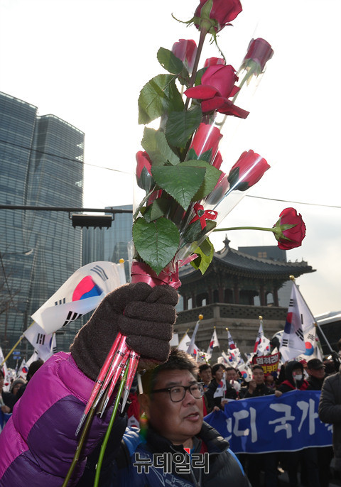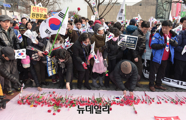 박사모를 비롯한 애국단체가 17일 오후 청와대 인근 삼청로에서 박근혜 대통령에게 전달 될 장미꽃을 헌화하고 있다. 참가자들은 줄을 서 장미꽃을 헌화하고, 직접 쓴 손편지를 놓아두기도 했다.