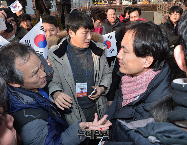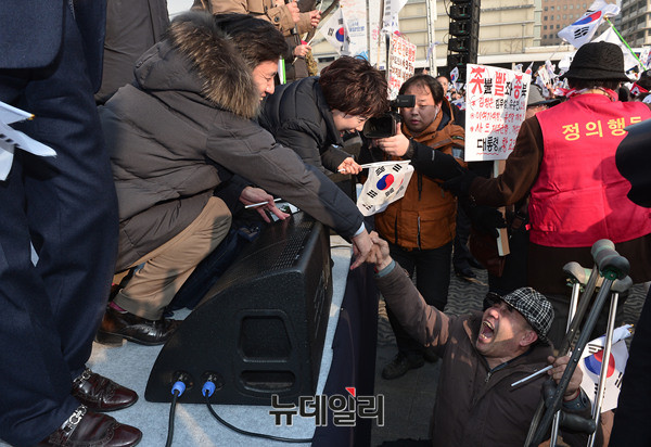 김진태 새누리당 의원이 17일 오후 세종문화회관 인근 광장에서 열린 박근혜 대통령 탄핵반대 집회 에서 참가자와 악수를 나누고 있다. 김 의원은 "뭐라도 보탬이 되고자 집회나왔다"며 "탄핵에 반대하는 여론도 굉장히 많으니 언론은 공정하게 보도해달라"고 말했다.