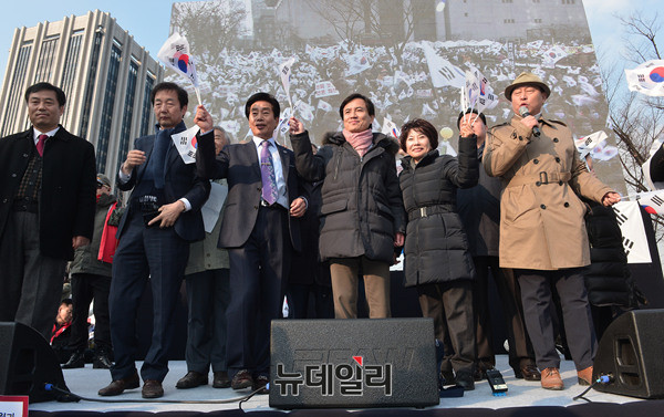 박사모를 비롯한 애국단체는 17일 오전 서울 종로구 헌법재판소 인근에서 박근혜 대통령 탄핵을 반대하는 대규모 집회를 열고 '국회해산', '탄핵무효' 등의 구호를 외쳤다. 참가자들은 태극기를 흔들며 집회에 임했다. 주최 측은 대형태극기와 장미꽃을 준비했다.