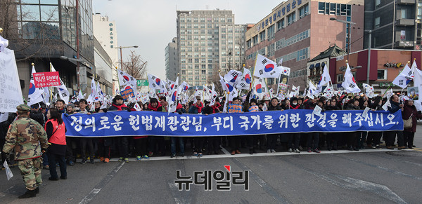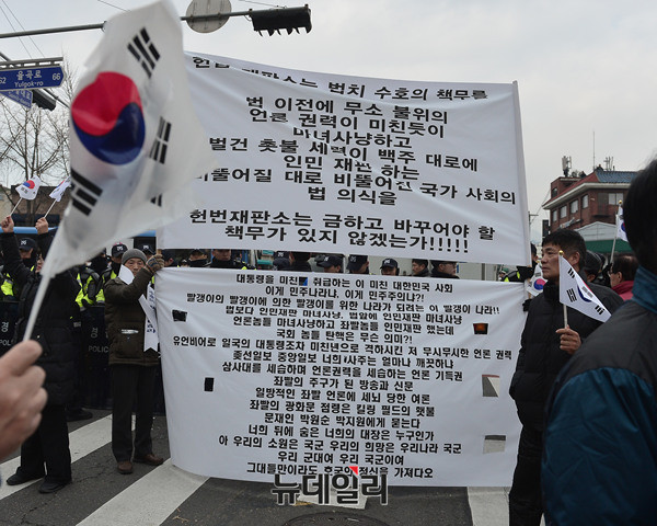 참가자들은 이날 오전 11시부터 헌법재판소 인근에서 박근혜 대통령 탄핵을 반대하는 대규모 집회를 열고 '국회해산', '탄핵무효' 등의 구호를 외쳤다. 참가자들은 태극기를 흔들며 집회에 임했다. 주최 측은 대형태극기와 장미꽃을 준비했다.