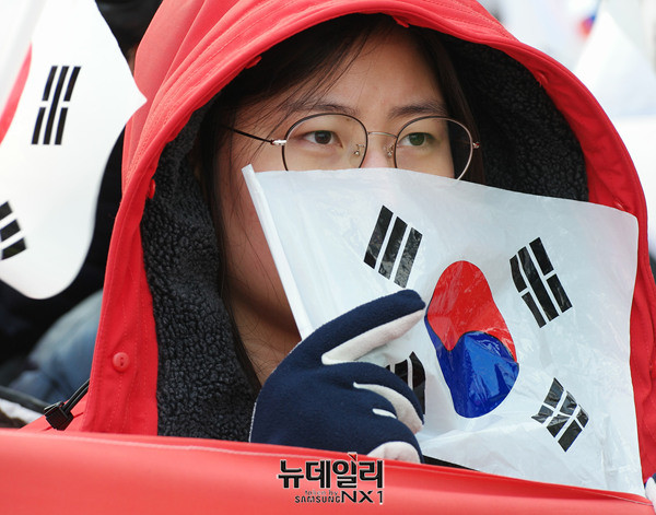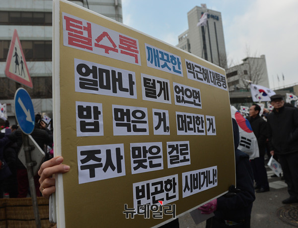 박사모를 비롯한 애국단체가 17일 오후 서울 종로구 헌법재판소 인근에서 박근혜 대통령 탄핵반대 집회를 연 가운데 참가자들이 "태극기가 휘날리면 촛불은 꺼진다"는 피켓을 들고 있다.