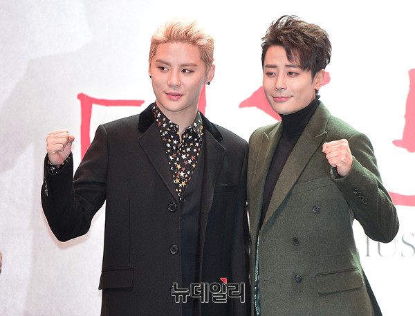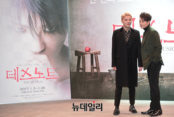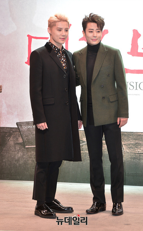 배우 김준수와 한지상(오른쪽)이 19일 오후 서울 송파구 잠실롯데콘서트홀에서 열린 뮤지컬 '데스노트' 제작발표회에 앞서 포토타임을 갖고 있다. 김준수는 라이토와 운명을 건 한판 승부를 벌이는 '엘(L)' 역을 맡았다.