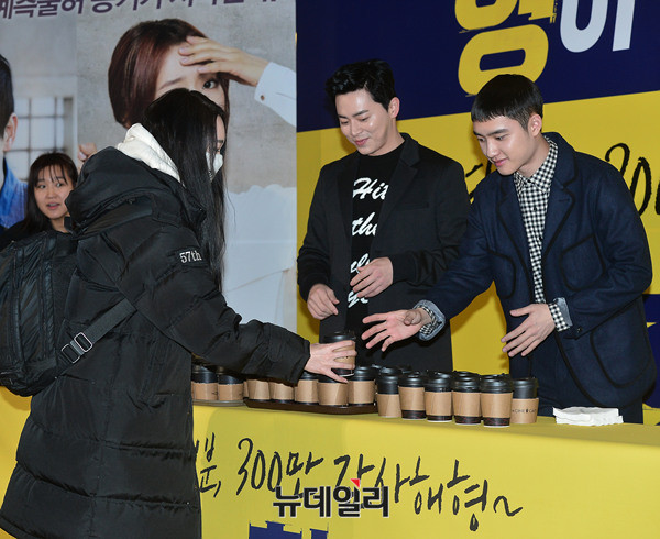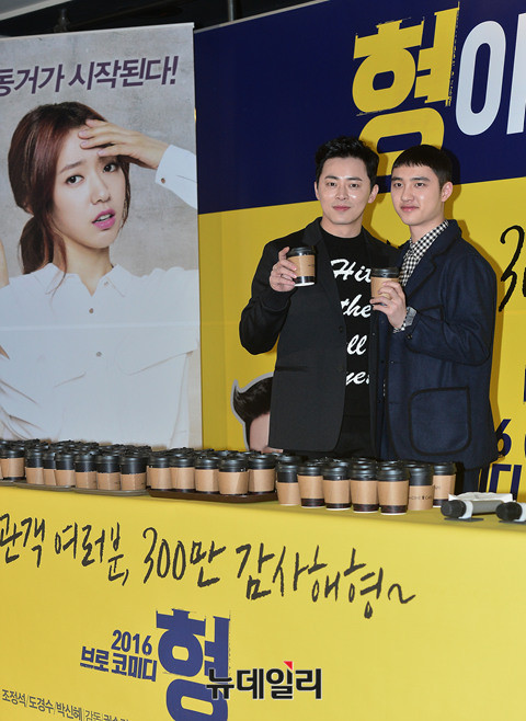 앞서 조정석과 도경수는 영화 '형'이 300만 돌파시 관객들에게 커피를 선물하겠다는 공약을 한 바 있다. 영화 '형'은 사기전과 10범의 형(조정석)과 국가대표 동생(도경수)의 동거 스토리를 그린 코미디물로 상영 중이다.