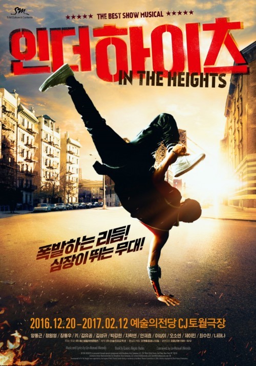 '인 더 하이츠'는 앞선 재연 확정 소식과 함께 양동근, 장동우(인피니트), 키(샤이니), 김유권(블락비), 김성규(인피니트), 차학연(빅스,N), 안재효(블락비)와 탄탄한 실력의 뮤지컬 배우 정원영, 박강현, 이상이, 오소연, 제이민, 최수진, 나하나의 캐스팅 공개로 화제를 모았다.또, 지난달 28일 본 공연에 앞서 진행된 '인 더 하이츠 월요 쇼케이스 In The Heights! In the Night!'는 주역들을 비롯한 조연, 앙상블 배우들까지 총 출동해 13인조 오케스트라에 맞춰 콘서트를 방불케 하는 열정적인 무대를 선사했다.뮤지컬 '인 더 하이츠'는 12월 20일부터 2017년 2월 12일까지 예술의전당 CJ토월극장에서 공연되며, 티켓 예매는 인터파크, 하나티켓, 예스24, 예술의전당에서 가능하다.