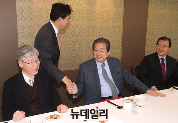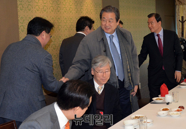 새누리당 김무성 전 대표가 20일 오후 서울 여의도의 한 식당에서 열린 비박계모임에 참석해 의원들과 인사를 나누고 있다.