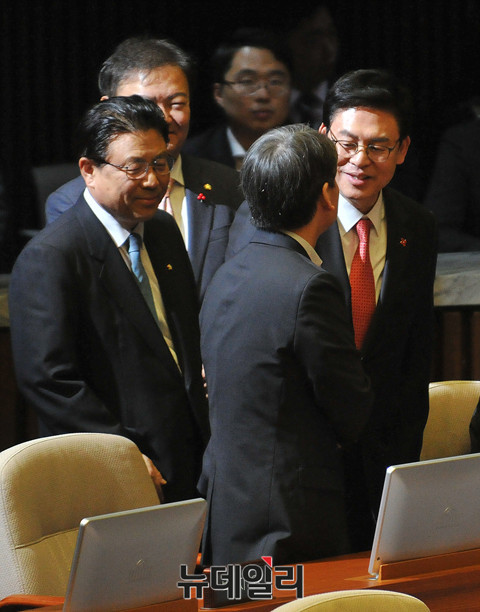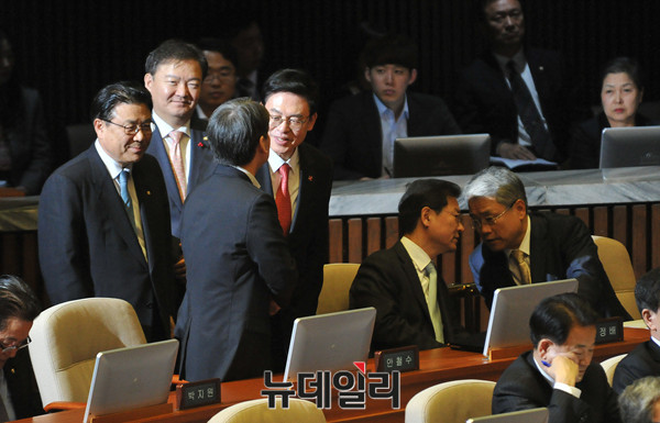 [포토] 국민의당 안철수 의원과 대화 나누는 새누리당 정우택 원내대표