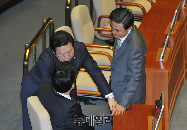 새누리당 정우택 신임 원내대표가 20일 오후 국회에서 열린 본회의에서 친박계 이장우, 김태흠 의원과 대화를 나누고 있다.